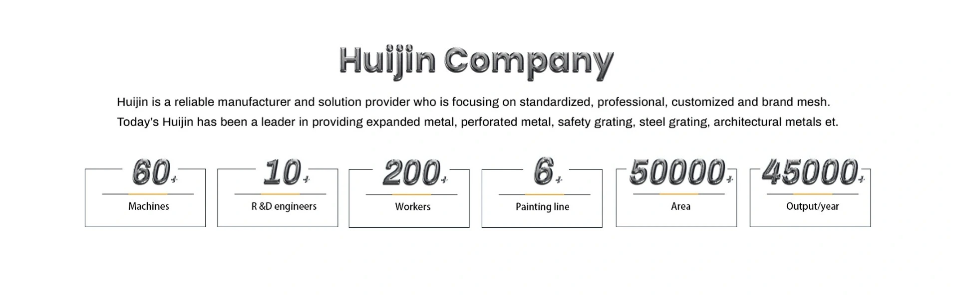 허베이성 안핑현에 위치한 Huijin Wire Mesh Co., Ltd는 중국 북부에서 확장된 금속 메쉬와 천공된 메쉬를 생산하는 최초이자 최대 규모의 전문 제조업체입니다. 우리는 또한 "허베이성 수출입 상공회의소 회원" 상을 받았습니다...