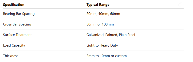 Ushbu spetsifikatsiyalar mintaqaga yoki ishlab chiqaruvchiga qarab farq qilishi mumkin. Misol uchun, Huijin metall to'rlari sanoat va arxitektura sohalarida moslashtirilgan po'lat podyum panjara echimlarini taklif qiladi.